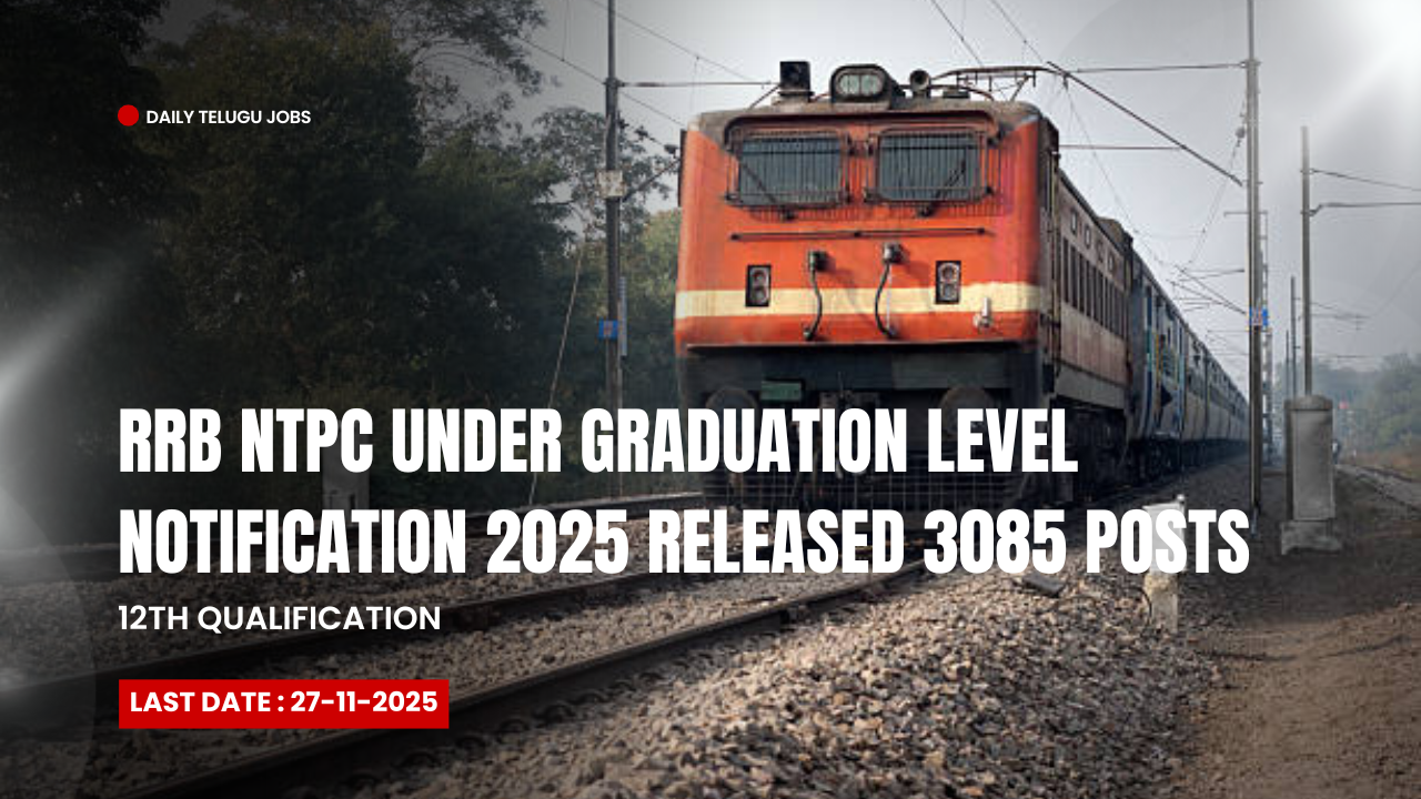 RRB NTPC Under Graduation Level Notification 2025 : RRB NTPC లో అయితే Under Graduation Level notification అయితే release చేయడం జరిగింది. దాదాపు 3058 Train Clerk, Junior Clerk Cum Typist మరియు ఇంకా చాలా పోస్ట్స్ అయితే రిలీజ్ చేశారు. ఎవరైతే గవర్నమెంట్ జాబ్ కోసం ఎదురు చూస్తున్నారా వాళ్లకి ఇది ఒక గొప్ప అవకాశం. ఈ ఆర్టికల్ లో ఈ నోటిఫికేషన్ గురించి పూర్తి వివరాలు ఉన్నాయి. మీ ఎలిబుల్ క్రైటీరియా చూసుకొని అఫీషియల్ వెబ్సైట్ నుండి అప్లై చేసుకోండి.
