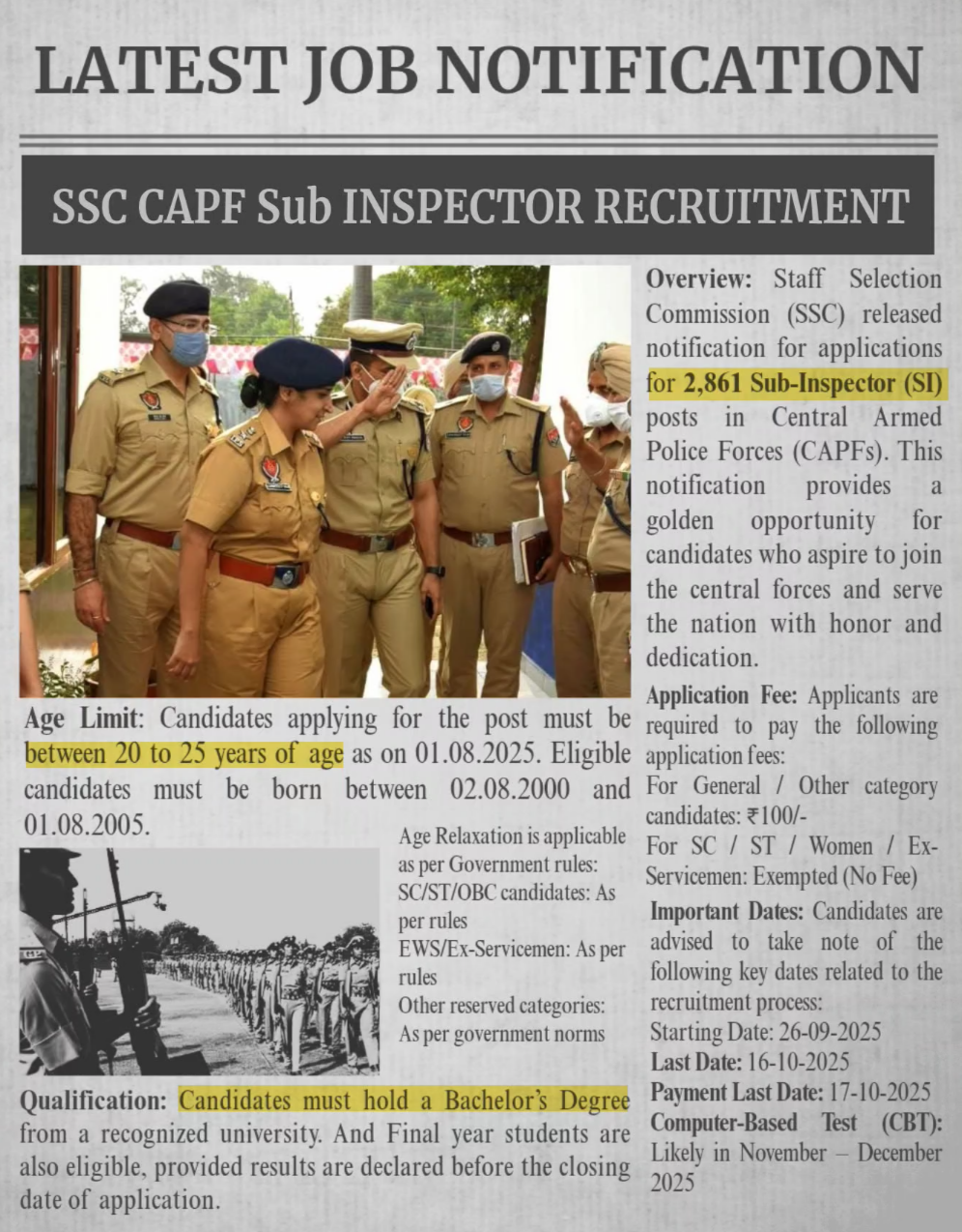 - SSC CAPF Sub Inspector Recruitment 2025 – Apply Online for 2861 SI Vacancies, Eligibility, Salary & Exam Date